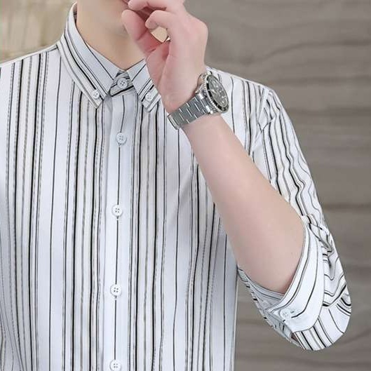 白ベースに縦に入ったストライプは、縦のラインを強調し、スタイリッシュな印象を与えるメンズシャツです。