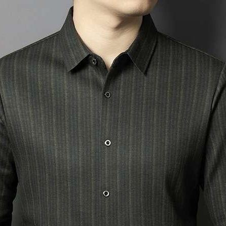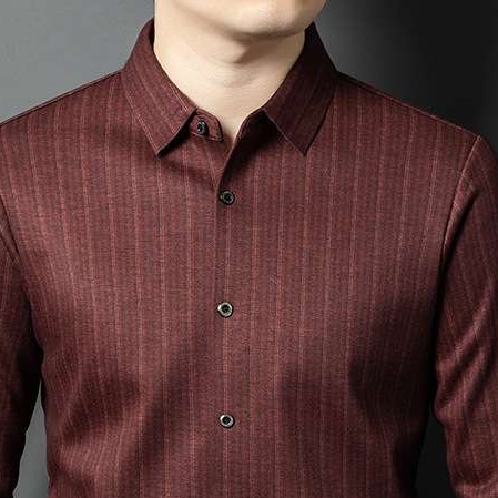 洗練された縦縞模様が知的な印象を演出し、クラシックな襟デザインがスタイリッシュさを引き立てます。