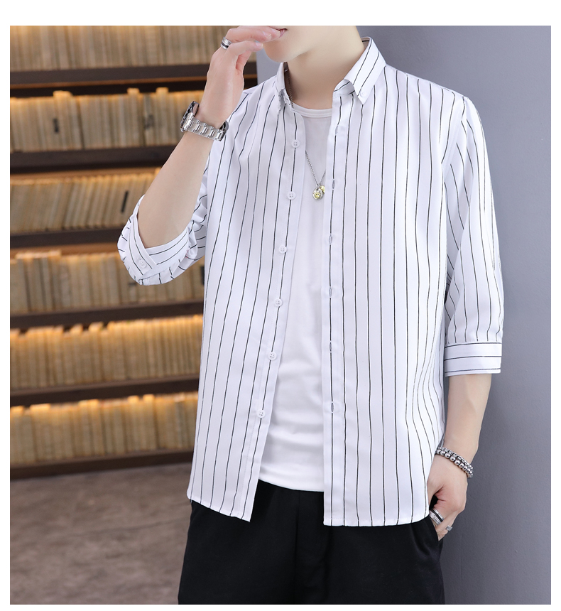 洗練された印象を与える縦縞デザインのストライプシャツです。