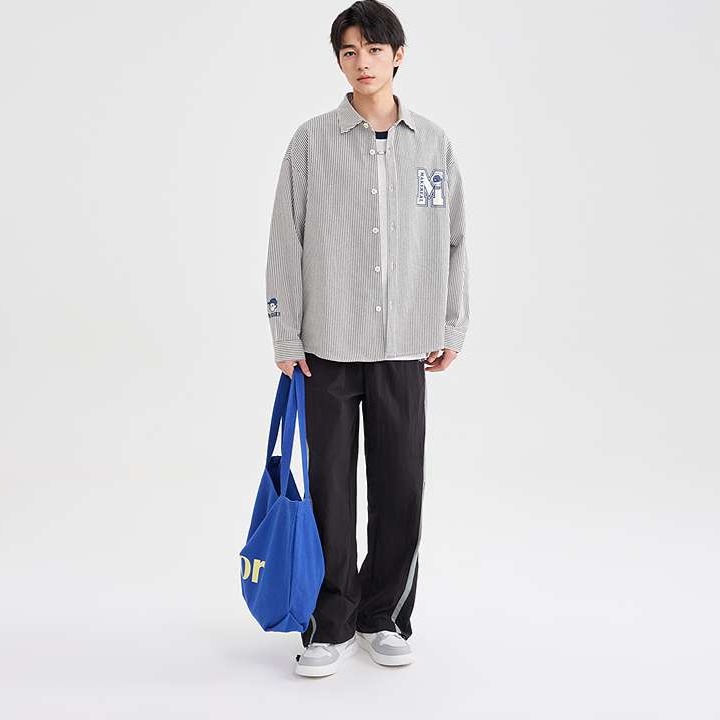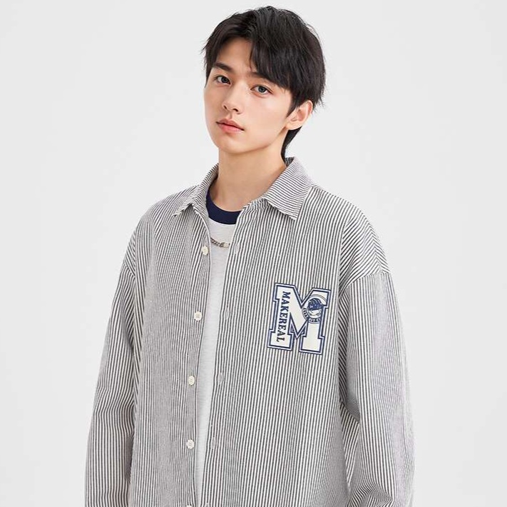 メンズ向けの洗練されたストライプシャツです。胸元に施された大胆なワンポイント刺繍がカジュアルな印象を与えます。
