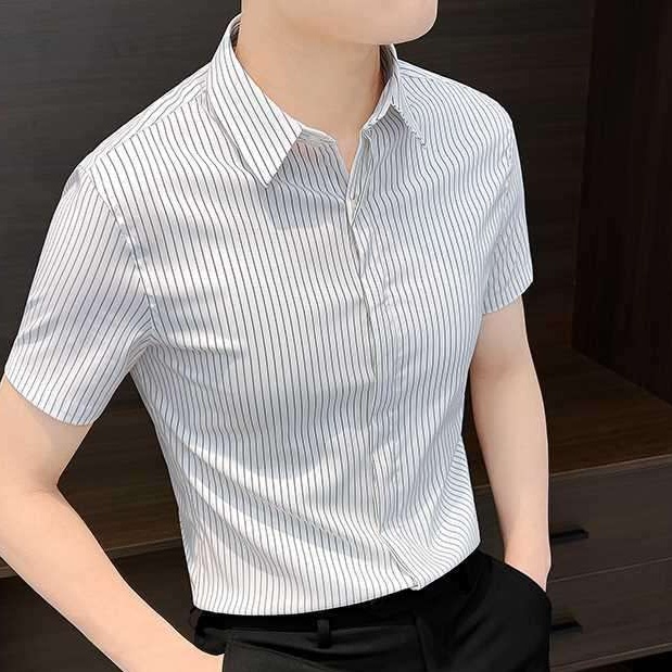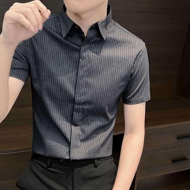 シンプルで洗練された細ストライプ柄のメンズシャツ。